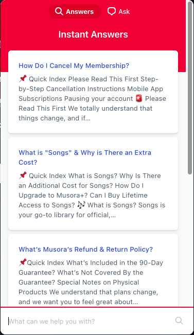 Under our "Answers" tab is a list of all of Musora's most frequently asked questions. Here you can find answers to common questions like "How do I change my Email?" & "How do I access another Instrument?". Before contacting us directly, we suggest you check this page out to see if we've already answered your question!